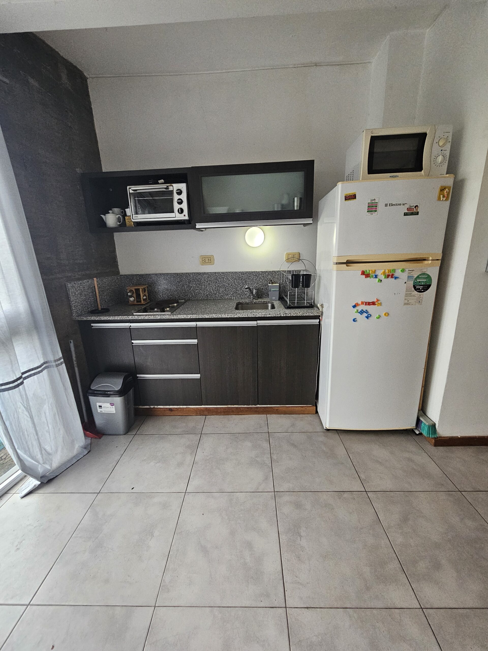 Planta baja living con cocina integrada dispone de anafe eléctrico y heladera con freezer