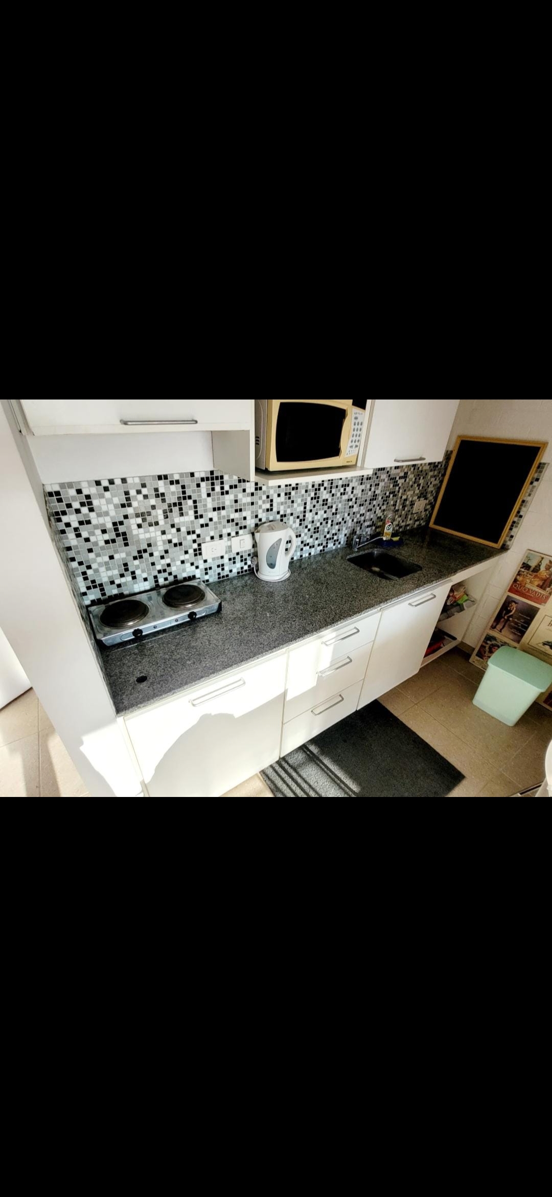 Cocina integrada con heladera con freezer anafe eléctrico y demas utensilios para una estadía confortable