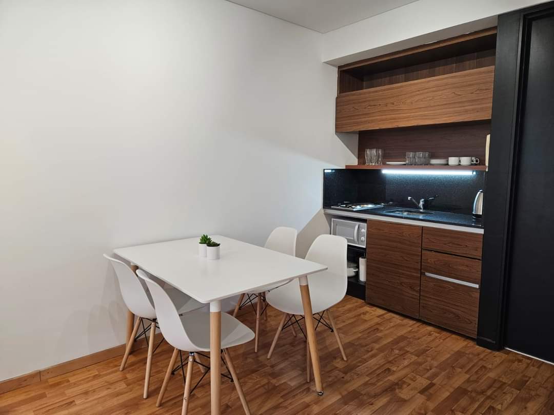 Posee Sommier Queen size o dos individuales( divisible), Smart TV y gran placard. Cocina integrada con anafe, microondas, heladera con freezer y mesa y sillas para 4 comensales.