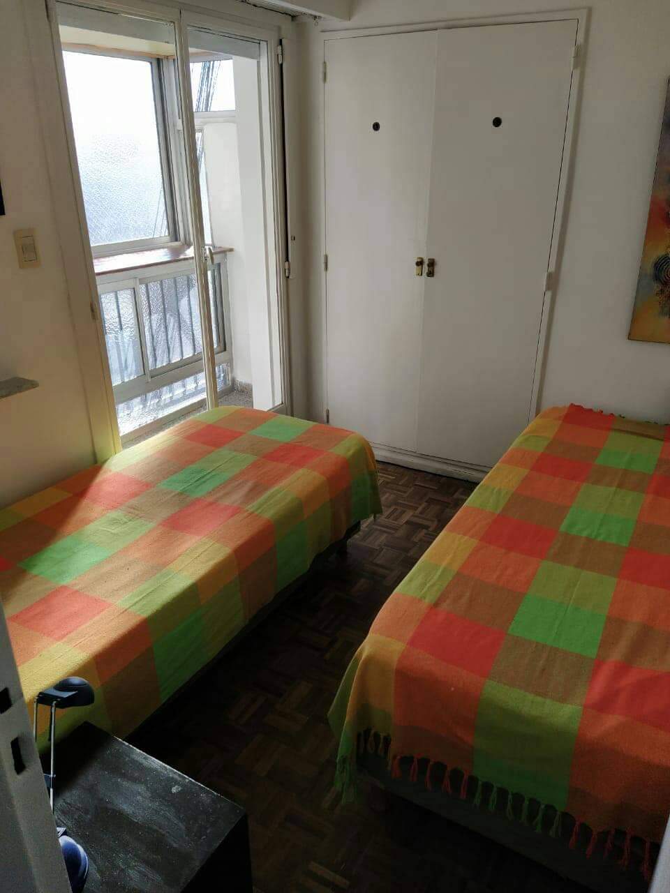 Semipiso de tres ambientes, ideal estudiantes extranjeros. Amplio living de 6 metros con hermosa vista al este, smart TV con rack. Muy luminoso con balcón en todos los ambientes. Agua caliente central con calefacción individual. Cocina completa con vajilla. Dos dormitorios con 2 camas individuales y una doble colchones Suavestar lujo. Baño a nuevo con box de ducha.