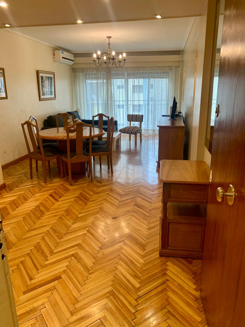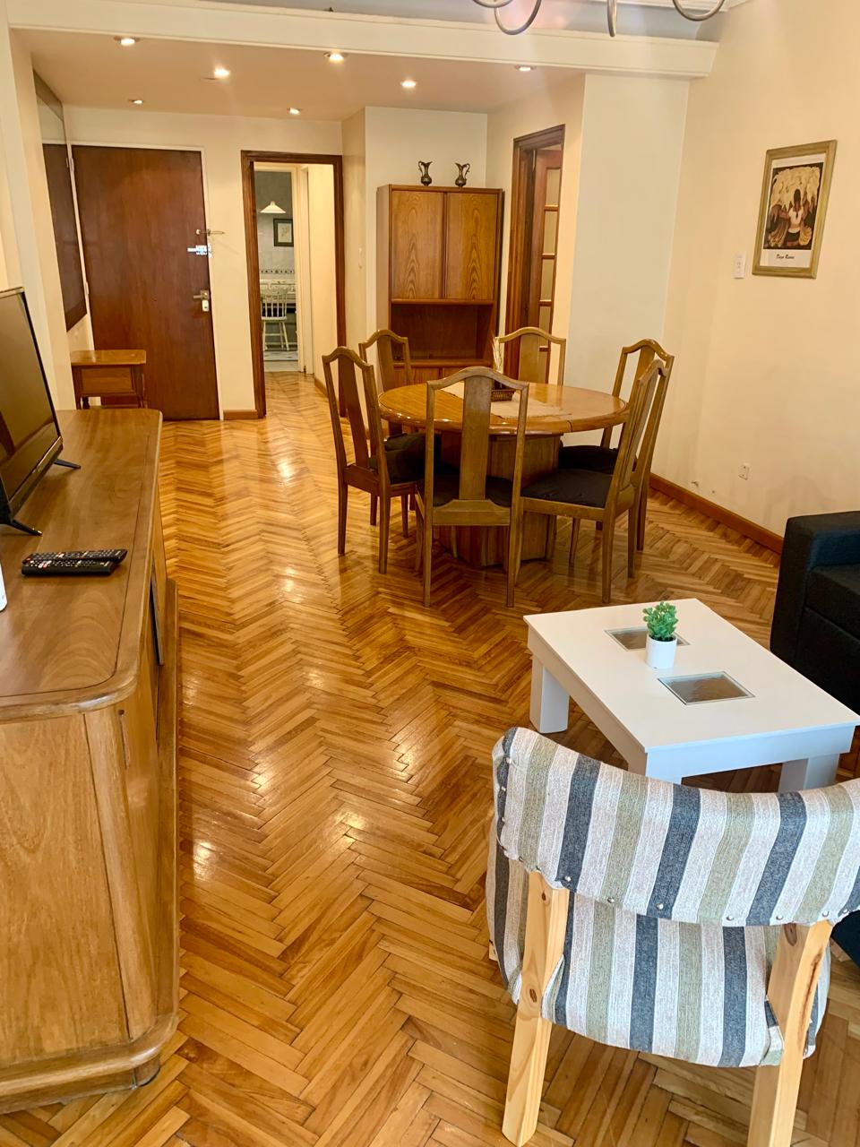 Ubicada en un cuarto piso, posee doble circulación y 2 entradas, la principal al frente por medio de un palier privado, por donde se accede al Living Comedor, completo con mesa y 6 Sillas, dos vajilleros: uno bajo y otro alto, 2 Sillones de 2 cuerpos y TV Smart, con aire acondicionado Frío /Calor, gran ventanal y balcón Corrido.